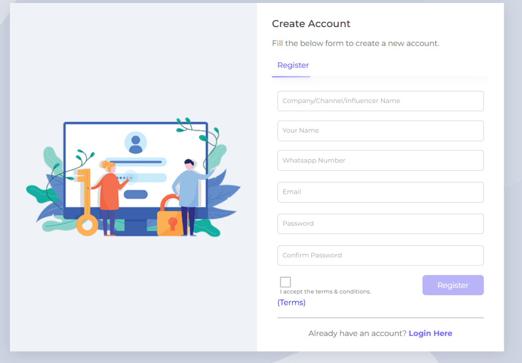 - तो इसमें आपको अकाउंट बनाने के लिए अपनी थोड़ी बहुत जानकारी देनी होगी जैसे आपकी कंपनी का नाम, आपका नाम, आपका नंबर, ईमेल, पासवर्ड इन सभी जानकारी को भरके आप Term & Condition accept करके Register बटन पर क्लिक करें।