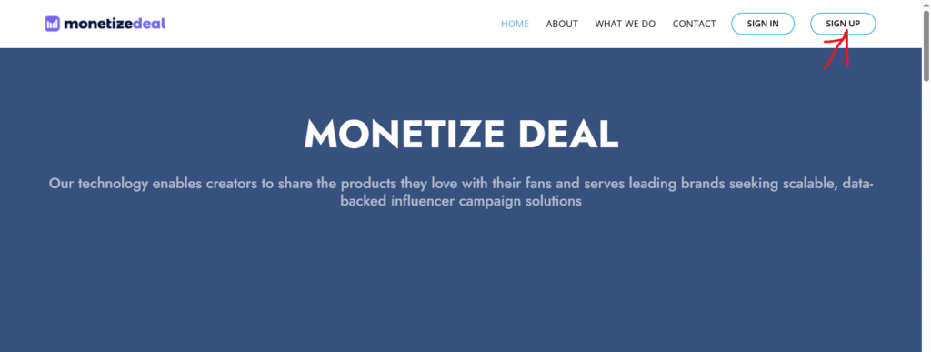 - सबसे पहले आप Monetizedeal वेबसाइट पर जाये फिर सबसे ऊपर ही आपको Sign Up का ऑप्शन दिखेगा।